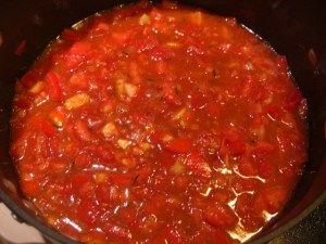Last night I made a tomato concoction with the tomatoes, two (large) cloves of garlic, some winter savory, salt, olive oil, and red wine…
