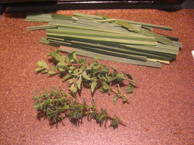 I’ve already used up the savory and oregano: in rustic marinara sauce, in a spinach alfredo-y kind of pasta, and in roasted potatoes. Winter savory is a wonderful herb for cooking vegetables. The lemongrass will last longer than the others. I’ll keep it around for tea and the occasional stir-fry or ramen soup.