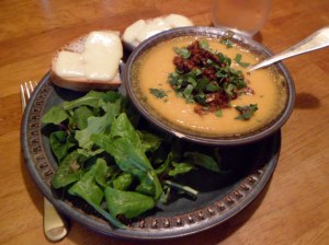 I had the soup for lunch one day with some lettuce the smallest spinach pieces for salad and some cheese toast. It was tasty, and I like the texture that the topping added. (Notice the fresh parsley!)