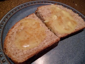 The bread is dense, and tasty. In fact, here’s what we had for a late-night snack yesterday: