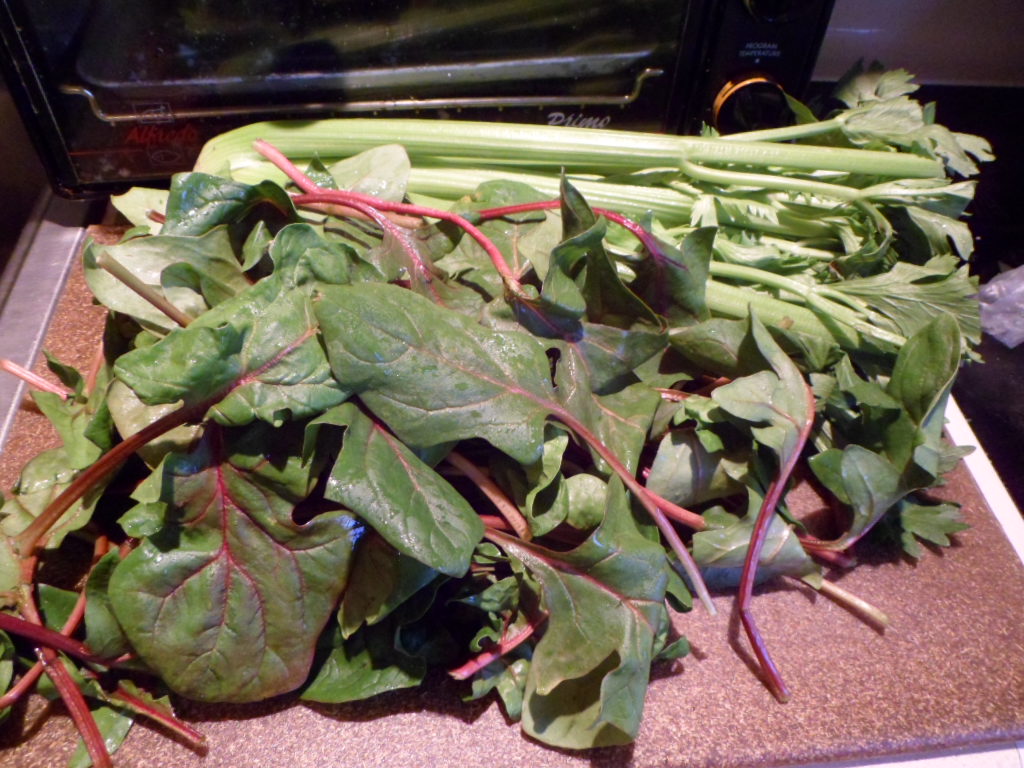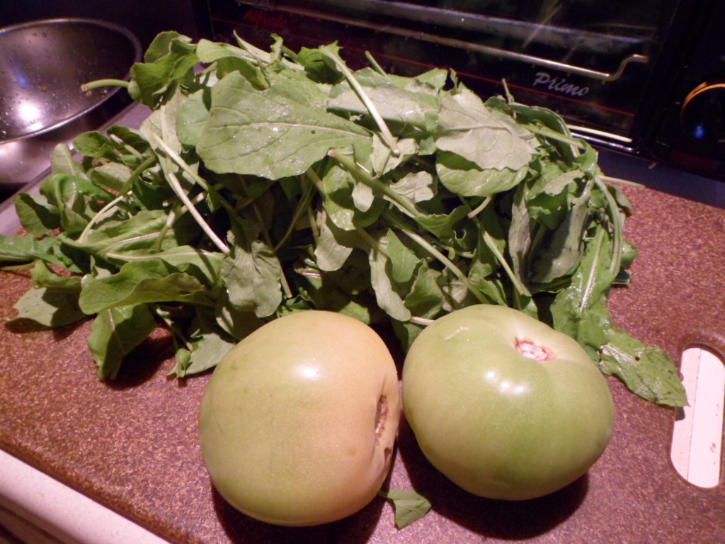 The green tomatoes basically sat on my table until they became red tomatoes. I cooked them today with onion and garlic and the ends of celery (shown below), some rosemary, pancetta, corn grits, and vegetable stock. The best of pantry eating!