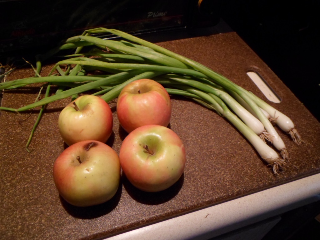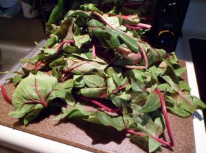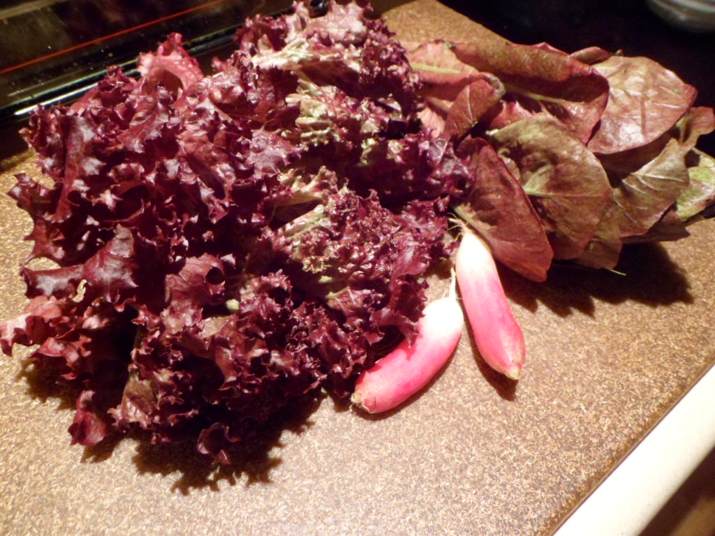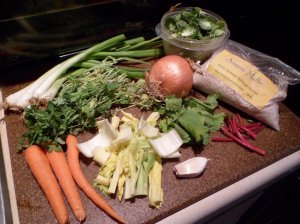The peashoots, green onions, Brussels sprout leaves, rice grits, Bordeaux spinach stems, and radish greens are from Farmers' Fresh. The carrots, celery, garlic, and onion are from Kroger.