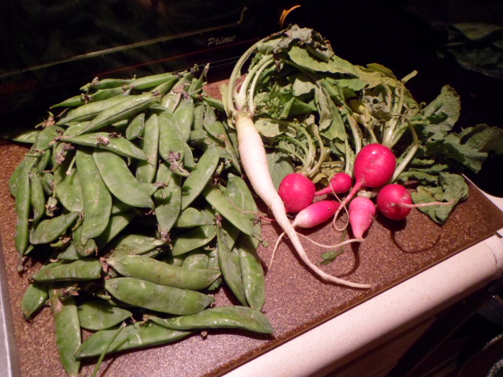 This is an interesting collection of radishes: French breakfast radishes, salad cherry radishes, and is that a baby Daikon?