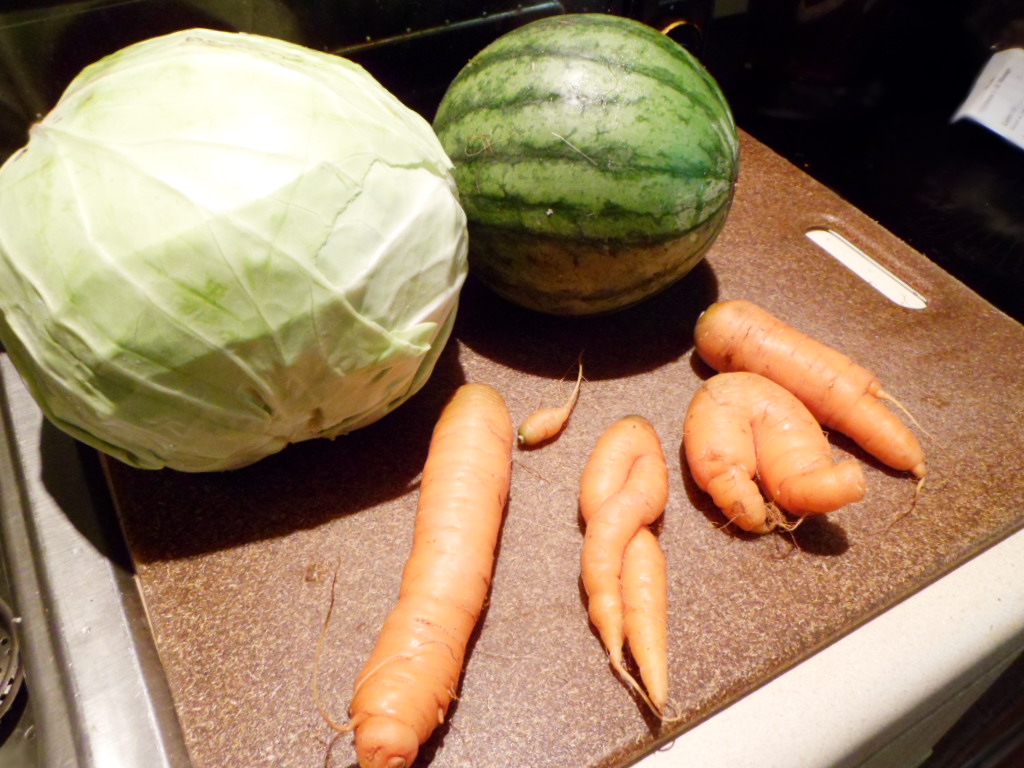 The cabbage is large and solid. He’ll keep for a good long while, so I’m going to let him settle into the crisper this week.
